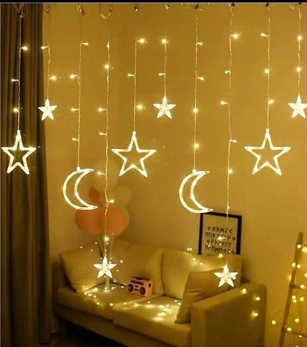 لمبات زينة عرض 3 متر تحتوي على 12 شريط لمبات مختلفة الاطوال ومتعددة الأنماط (2: هلال، 6: نجوم صغيرة، 4: نجوم كبيرة) - تعمل بالكهرباء 220 فولت