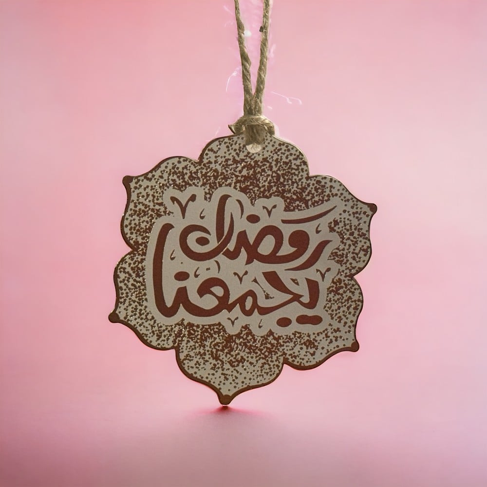 7- بطاقة هدايا لون أبيض وكتابة وزخرفة بلون ذهبي تحتوي على عبارة رمضان يجمعنا 12 حبة وبالامكان استخدامها ك زينة جدارية او لتزيين الطاولات وأدوات تقديم الطعام