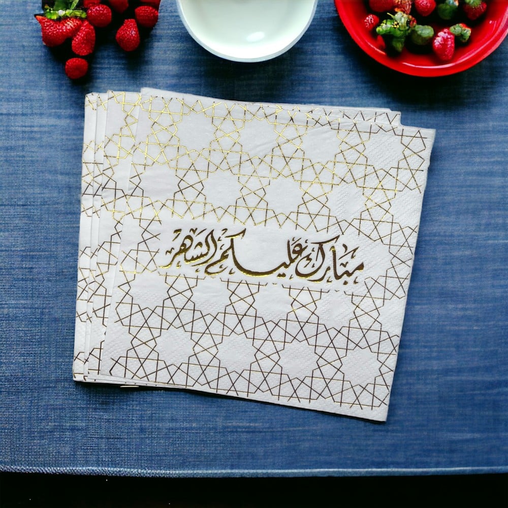 8- مناديل ضيافة بيضاء مطبوع عليها بالذهبي - عدد 25 حبة