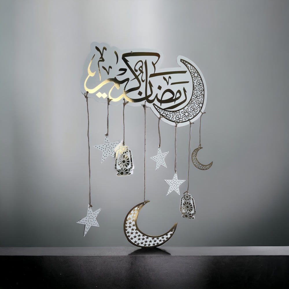 3- زينة جدارية لون أبيض وكتابة ذهبي من 8 قطع تحمل عبارة "أهلا رمضان" مع حبل للتعليق